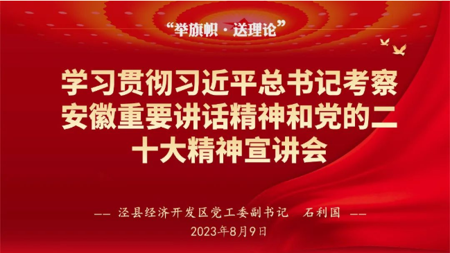 宣講中,涇縣經濟開發(fā)區(qū)黨工委副書記石利國深入解讀了習近平總書記考察安徽重要講話精神,全面系統地闡釋了黨的二十大精神,并緊密結合企業(yè)實際,就推動學習貫徹習近平總書記考察安徽重要講話精神和黨的二十大精神走深走實走心提出意見建議,為大家做了一場內容豐富、思想深刻、生動精彩的宣講。
