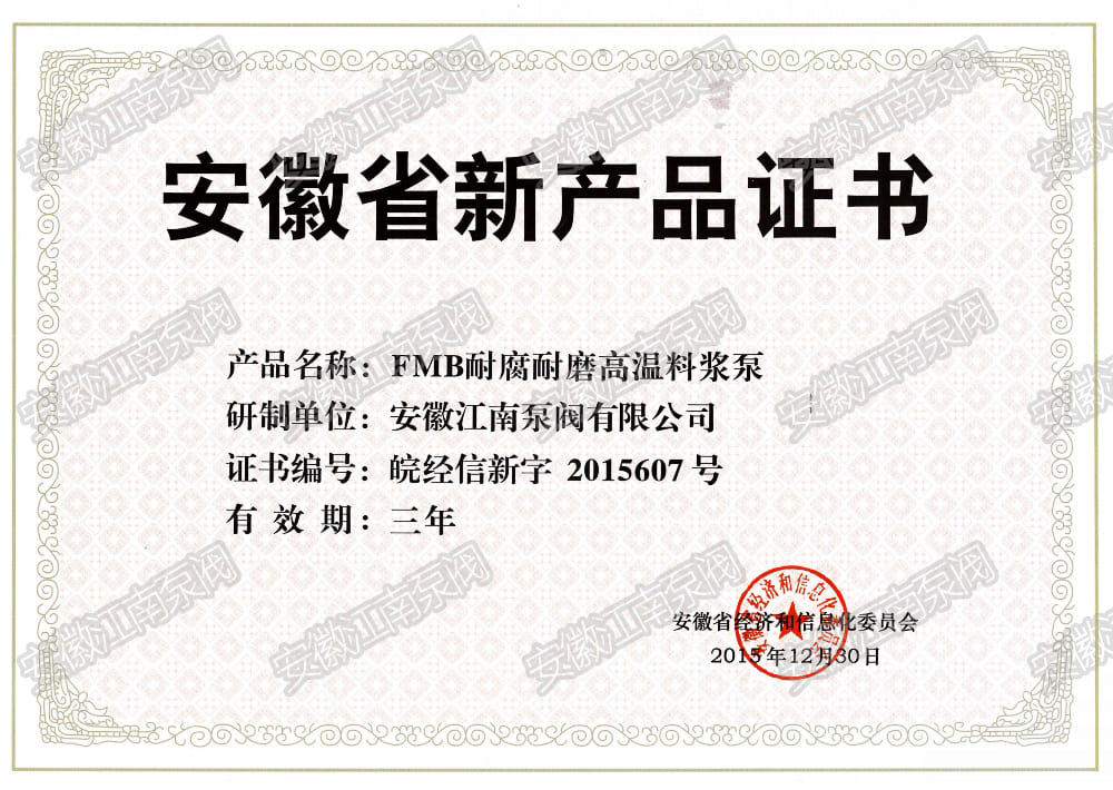 安徽江南泵閥有限公司榮獲安徽省FMB砂漿泵新產(chǎn)品證書,主營:氟塑料泵,不銹鋼泵,耐腐蝕化工泵,品質(zhì)卓越,行業(yè)領(lǐng)跑企業(yè),科研生產(chǎn)型企業(yè)20年鑄就行業(yè)輝煌!...