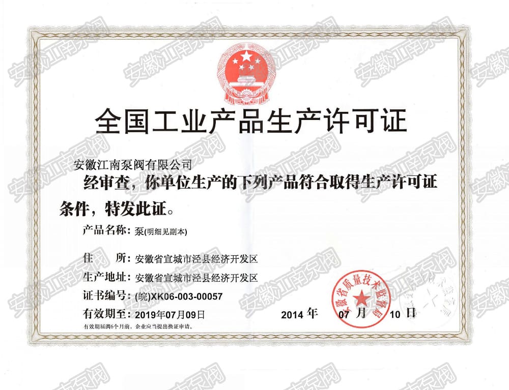 安徽江南泵閥有限公司榮獲工業(yè)產(chǎn)品生產(chǎn)許可證書(shū),主營(yíng):氟塑料泵,不銹鋼泵,耐腐蝕化工泵,品質(zhì)卓越,行業(yè)領(lǐng)跑企業(yè),科研生產(chǎn)型企業(yè)20年鑄就行業(yè)輝煌!...