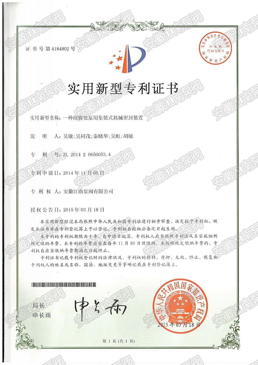 安徽江南泵閥有限公司榮獲新型耐腐蝕泵集裝式機(jī)械密封專利,主營:氟塑料泵,不銹鋼泵,耐腐蝕化工泵,品質(zhì)卓越,行業(yè)領(lǐng)跑企業(yè),科研生產(chǎn)型企業(yè)20年鑄就行業(yè)輝煌!...